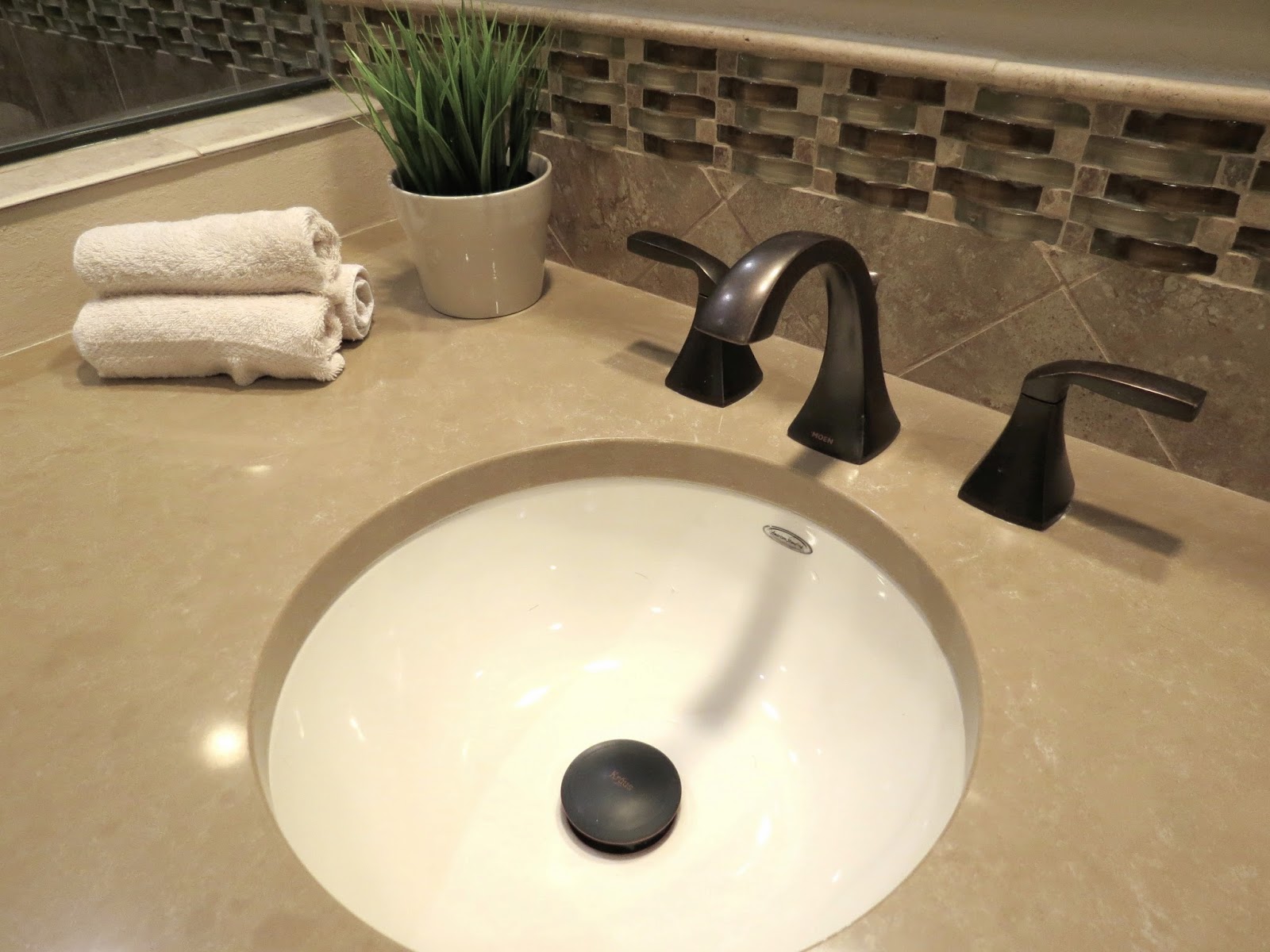 I just love this gorgeous quartz slab on both vanities. It has such a rich look and makes for easy cleaning with the undermount sinks..... not to mention the gorgeous oiled rubbed bronze fixtures and accessories that add to the overall luxury of the space.